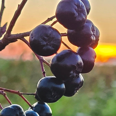 Firstly, Aronia berries are like precious gems, each cradling a cluster of seeds wrapped in the nurturing embrace of their deep, dark pigments. These rich hues not only offer vibrant beauty but serve as a protective shield, safeguarding the seeds within and ensuring their journey of life can continue, adapting and regenerating with each generation!